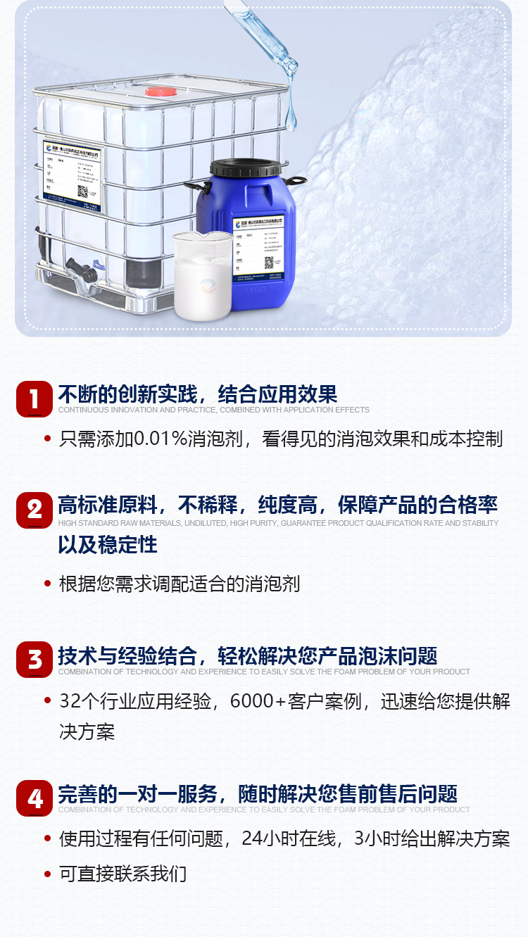 ①消泡、抑泡力強,用量少,不影響起泡體系的基本性質。 ②具有良好的耐高溫,耐酸堿性好,化學性穩定,快速相溶。 ③分散性好,相溶性強,不會改變產品原有外觀和性能,保障均勻,不影響制版印刷質量,穩定生產效率。 ④在水中可自乳化,消除細小微泡,除氣性強,消泡快速,抑泡能力好,防止表明缺陷。